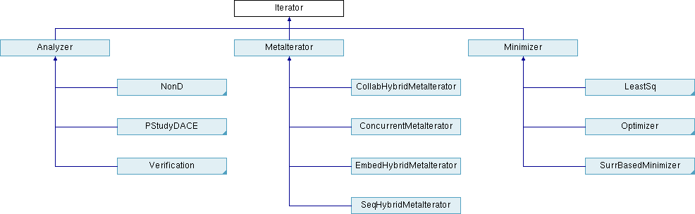 The Iterator class is the base class for one of the primary class hierarchies in Dakota. The iterator hierarchy contains all of the iterative algorithms which use repeated execution of simulations as function evaluations.