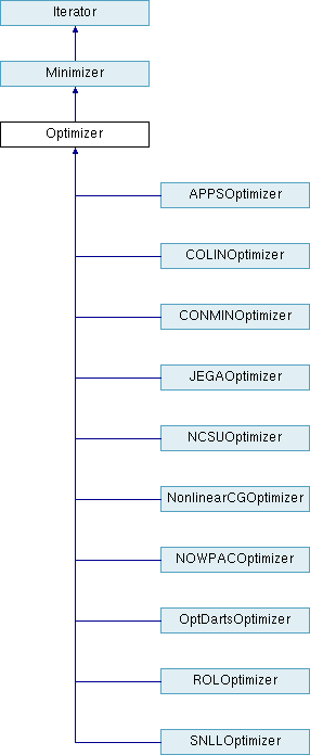 The Optimizer class provides common data and functionality for DOTOptimizer, CONMINOptimizer, NPSOLOptimizer, SNLLOptimizer, NLPQLPOptimizer, COLINOptimizer, OptDartsOptimizer, NCSUOptimizer, NonlinearCGOptimizer, NomadOptimizer, and JEGAOptimizer.