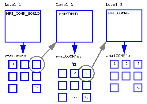 It is important to recognize that these four parallelism sources can be combined recursively. For example, a meta-iterator can schedule and manage concurrent iterators, each of which may manage concurrent function evaluations, each of which may manage concurrent analyses, each of which may execute on multiple processors. Moreover, more than one source of sub-iteration concurrency can be exploited when combining meta-iteration and nested model sources. In an extreme example, defining the Pareto frontier for mixed-integer nonlinear programming under mixed aleatory-epistemic uncertainty might exploit up to four levels of nested sub-iterator concurrency in addition to available levels from function evaluation concurrency, analysis concurrency, and simulation parallelism. The majority of application scenarios, however, will employ one to two levels of parallelism.