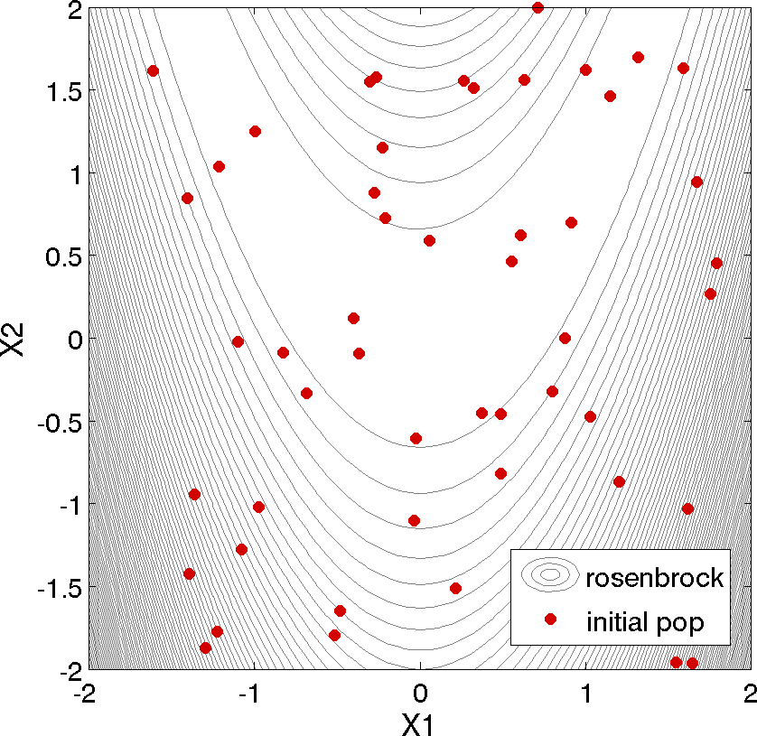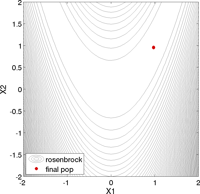 While pattern search algorithms are useful in many optimization problems, this example shows some of the drawbacks to this algorithm. While a pattern search method may make good initial progress towards an optimum, it is often slow to converge. On a smooth, differentiable function such as Rosenbrock’s function, a nongradient-based method will not be as efficient as a gradient-based method. However, there are many engineering design applications where gradient information is inaccurate or unavailable, which renders gradient-based optimizers ineffective. Thus, pattern search algorithms are often good choices in complex engineering applications when the quality of gradient data is suspect.